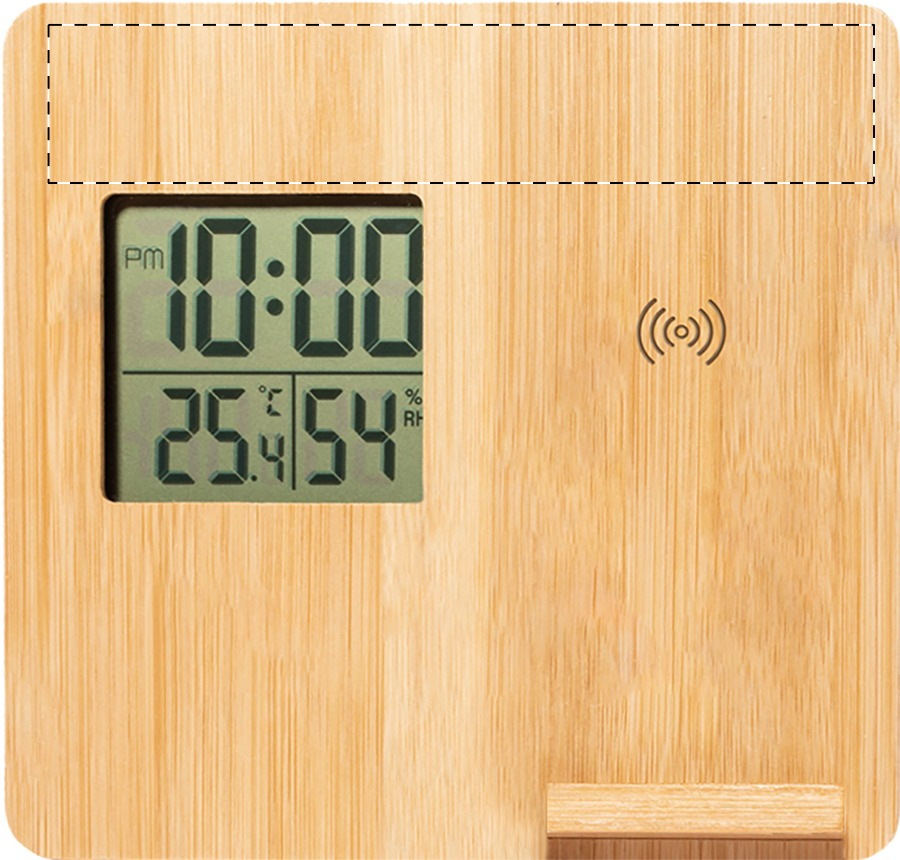 Wetterstation aus Bambus mit Handyhalterung und integriertem Wireless-Fast-Charger (10 W). Funktionen: Wecker, Temperatur und Luftfeuchtigkeit. Inklusive Knopfzellenbatterie und USB-Kabel.