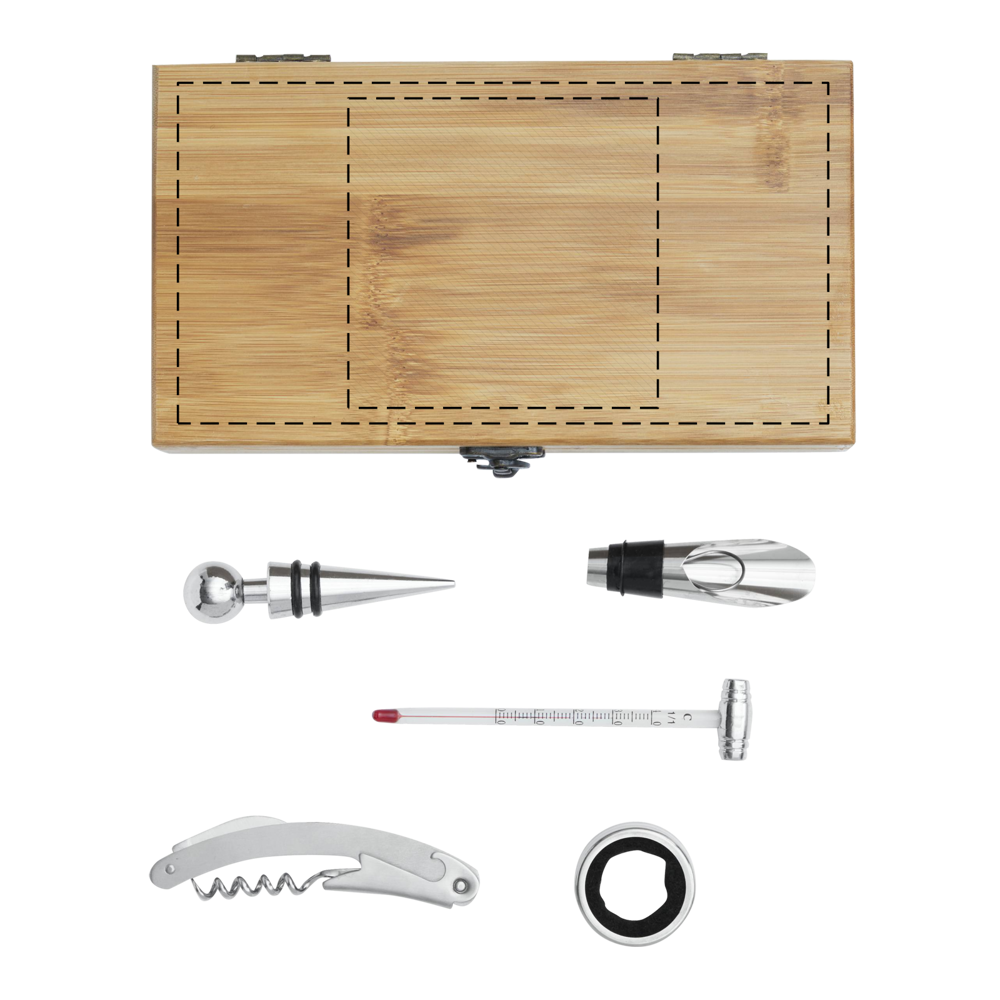 Weinset BAMBOO PLEASURE, in Bambus-Box, 6-teilig: mit Weinthermometer aus Glas, Edelstahl-Tropfring, Metall-Flaschenverschluss, Metall-Ausgießer und Edelstahl-Kellnermesser, in Box