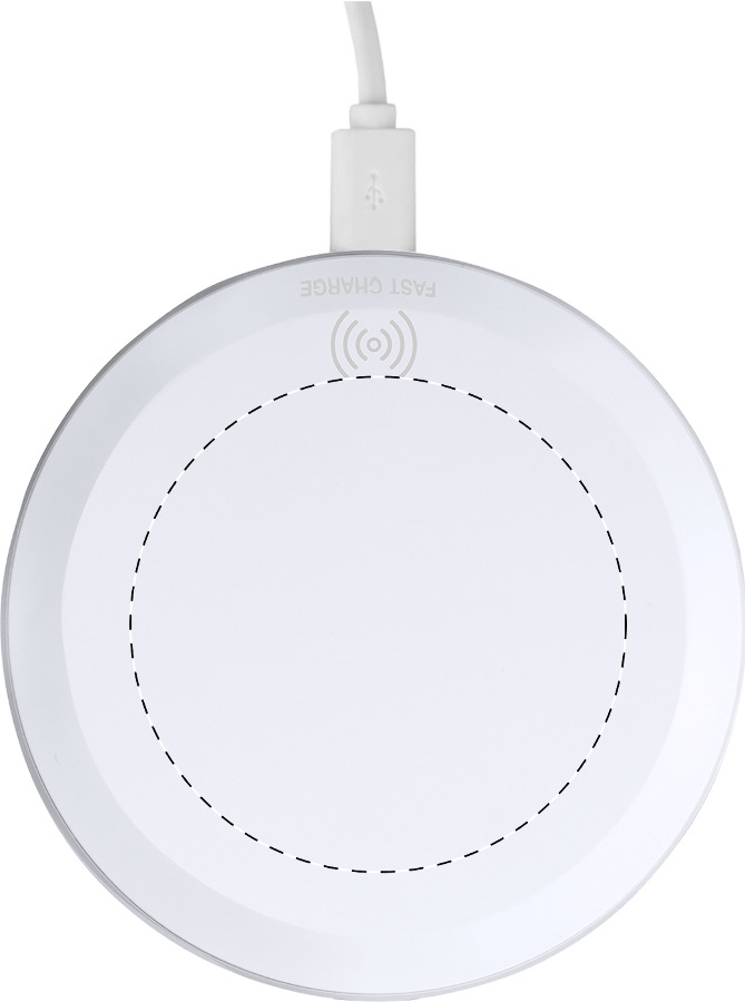 Wireless-Fast-Charger (10 W) in rundem Kunststoffgehäuse mit LED-Ladeanzeige und Anti-Rutsch-Beschichtung. Inkl. USB-Ladekabel.