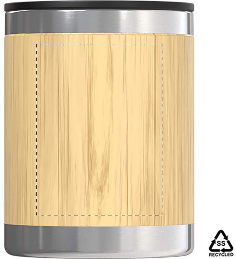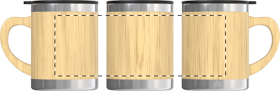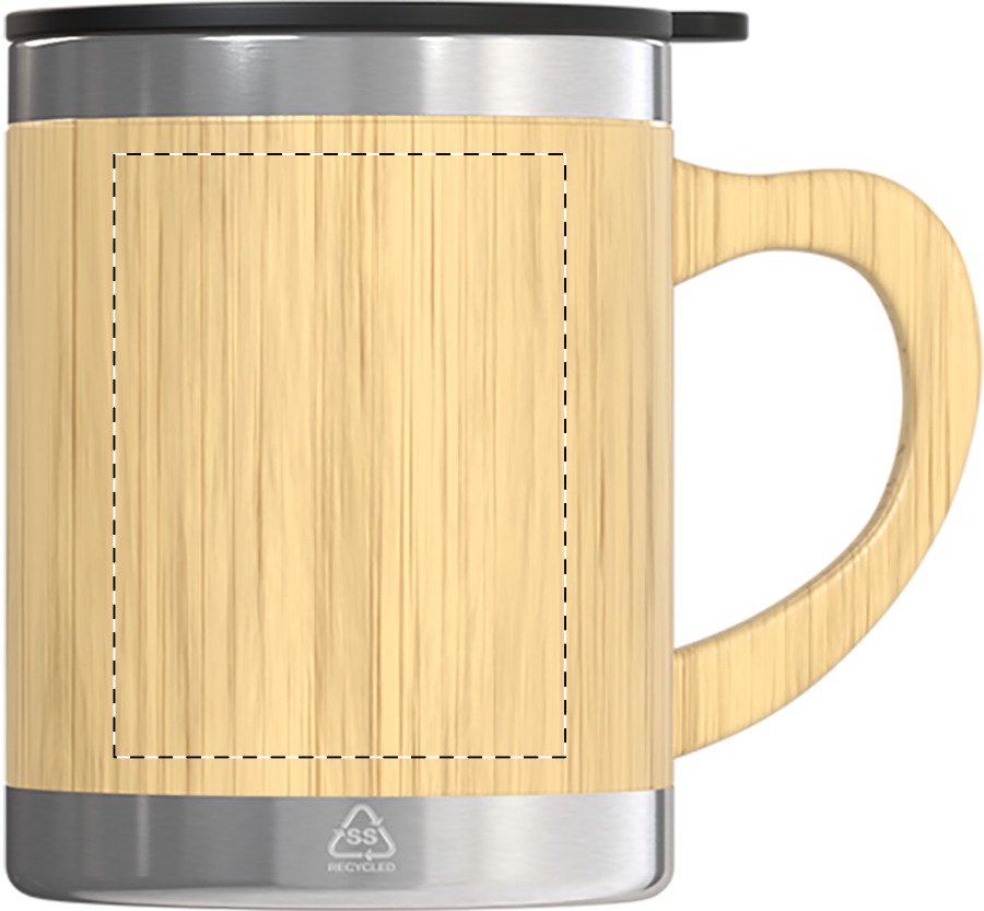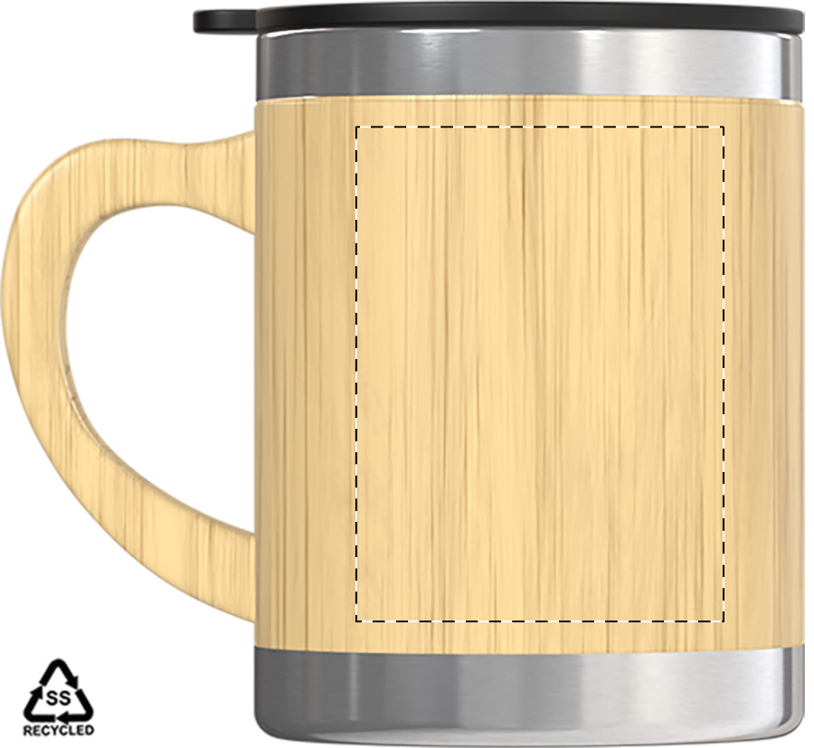 Isolierbecher aus recyceltem Edelstahl mit Bambusüberzug, Bambusgriff und PP-Trinkdeckel, doppelwandig. Füllmenge: 300 ml.