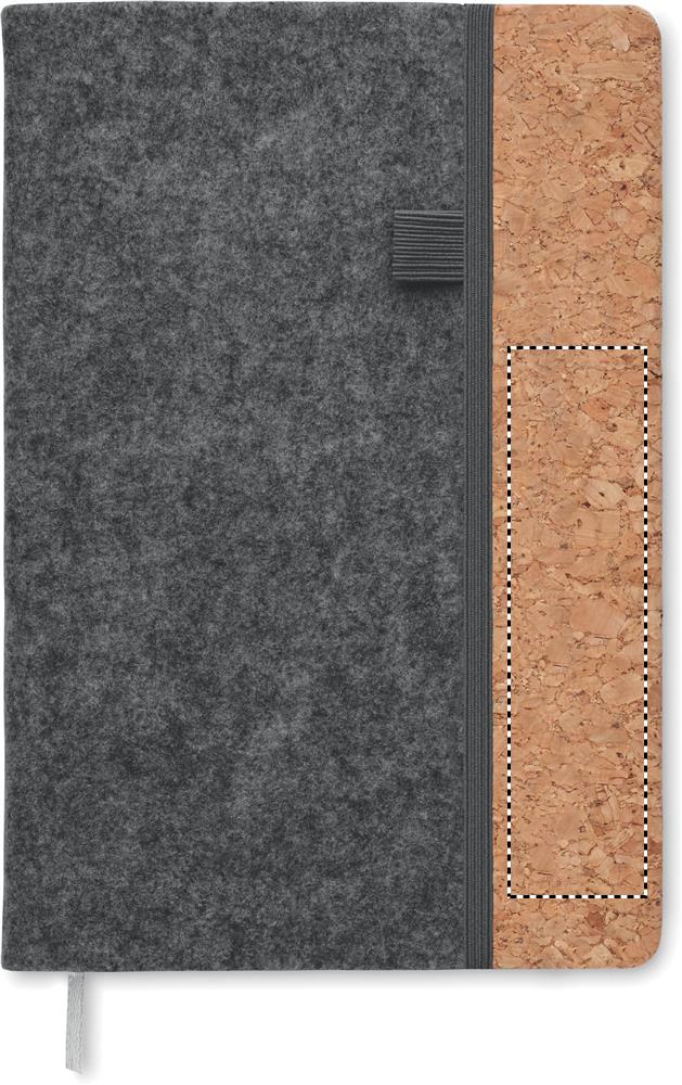 DIN A5 Notizbuch mit Cover aus RPET-Filz und Kork. 80 Blatt (160 Seiten) liniertes Recyclingpapier. Elastisches Verschlussband, Lesebändchen und Stiftschlaufe. FSC®-certified | FSC MIX CREDIT, P7.1, FSC-C213206