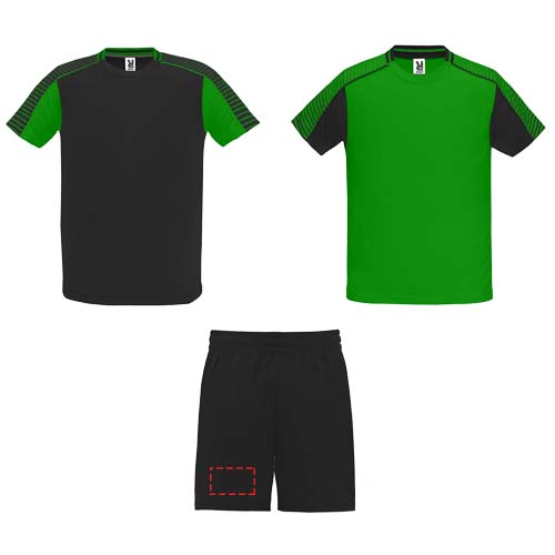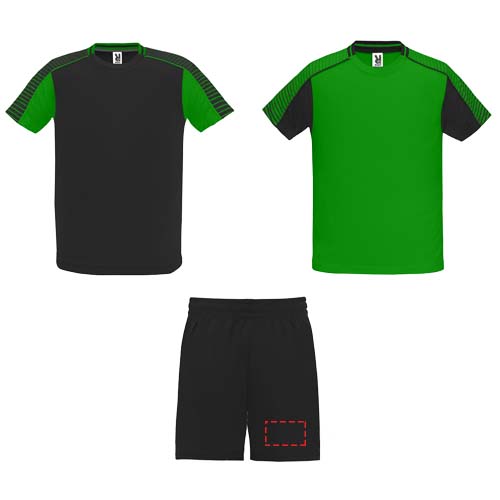 Das Set besteht aus 2 T-Shirts und 1 Paar Shorts. Die Farbe des zweiten T-Shirts ist der des ersten entgegengesetzt. Atmungsaktiver Funktionsstoff. T-Shirts mit bedruckten Halb-Raglanärmeln. Rundhalsausschnitt mit Trikotstoff auf der Rückseite. Shorts mit elastischem Bund und innenliegendem Kordelzug mit Sicherheitsnähten. Seitliches Kontrastband und Seitenschlitze am Hosenbein. Abnehmbares Etikett.