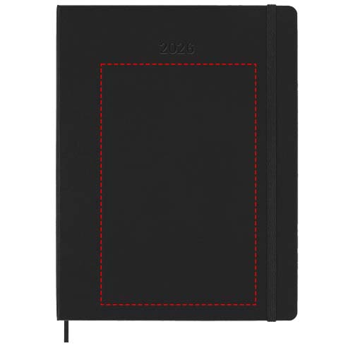 Der von Januar bis Dezember 2026 datierte Moleskine XL Hardcover-Wochenplaner für 12 Monate zeigt die ganze Woche auf einen Blick, bietet aber auch Jahres- und Monatsübersichtsseiten für einen breiteren Jahresüberblick, gefolgt von Seiten für Reiseplanung, Ideen und Ziele. Auf der einen Seite sind die Wochentage dargestellt, gegenüber befindet sich eine linierte Seite, auf der Notizen eingetragen werden können. Er enthält elfenbeinfarbenes, säurefreies Papier, einen schwarzen, elastischen Verschluss, ein Seitenband, eine farblich abgestimmte, erweiterbare Innentasche und Aufkleber zur persönlichen Gestaltung sowie Jahresaufkleber für den Buchrücken.