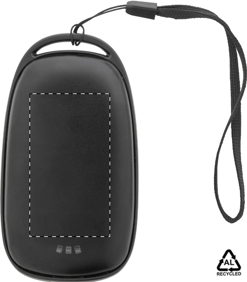 Elektrischer Handwärmer aus recyceltem Aluminium mit 3 Intensitätsstufen und integrierter 4000 mAh Powerbank. Mit USB- und USB-C-Ladeanschlüssen. USB-C-Eingang. Inklusive Tragegurt und USB-Ladekabel.