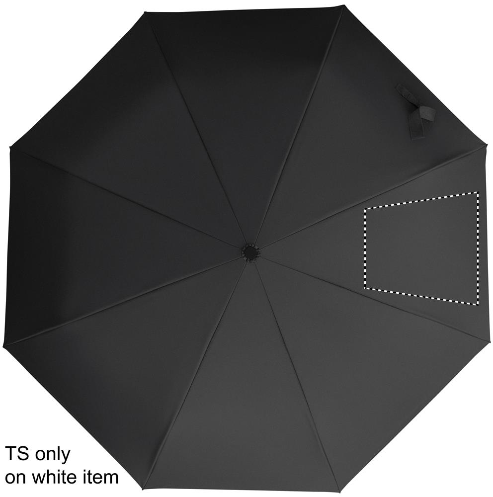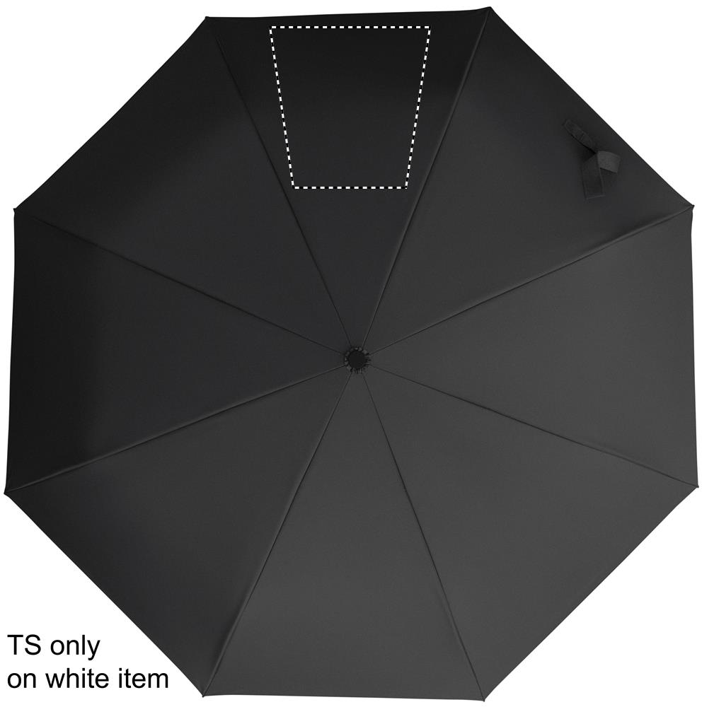 21'' Regenschirm aus 190 T RPET Pongee. Windbeständig. Schwarz überzogenes 2-teiliges Fiberglasgestell, Stangen aus Fiberglas. Gummierter D-förmiger Karabinergriff. Passende Schirmhülle. Automatische Öffnung und Schließung.