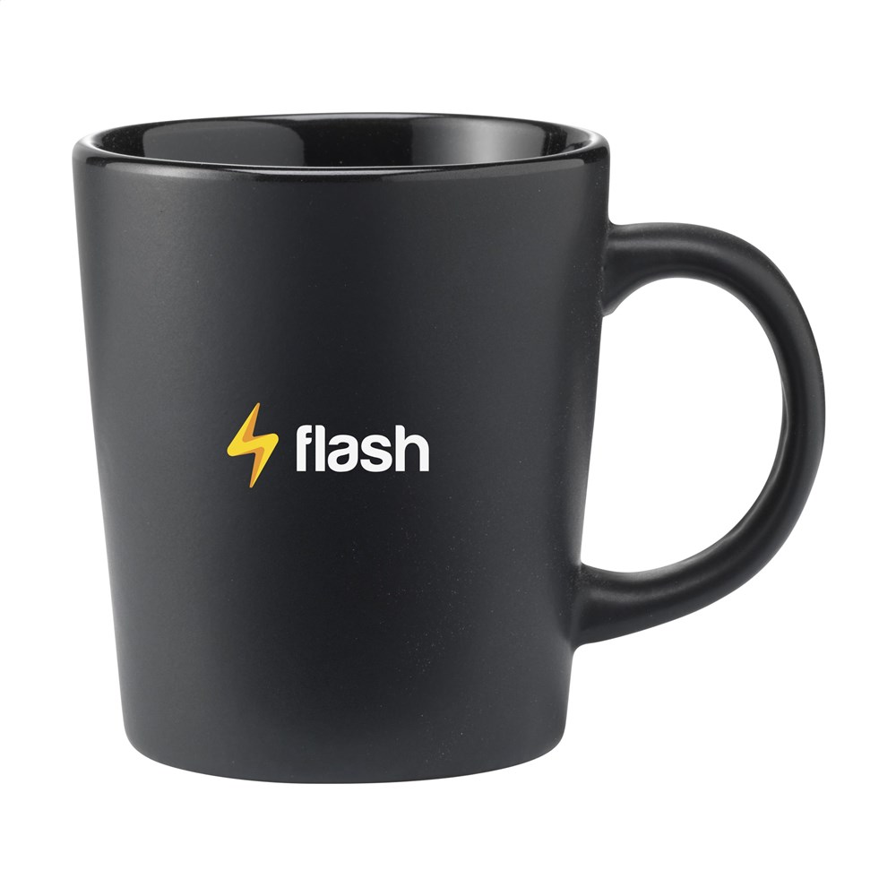 Auffälliger Becher in ansprechendem Design. Aus hochwertiger Keramik gefertigt und mit einer matten Deckschicht versehen. Fassungsvermögen 250 ml. NOTIZ: Der weiße Becher kann nicht mit einer Lasergravur versehen werden, da diese nicht ausreichend sichtbar ist. Der Druck ist spülmaschinengeprüft und zertifiziert: EN 12875-2.